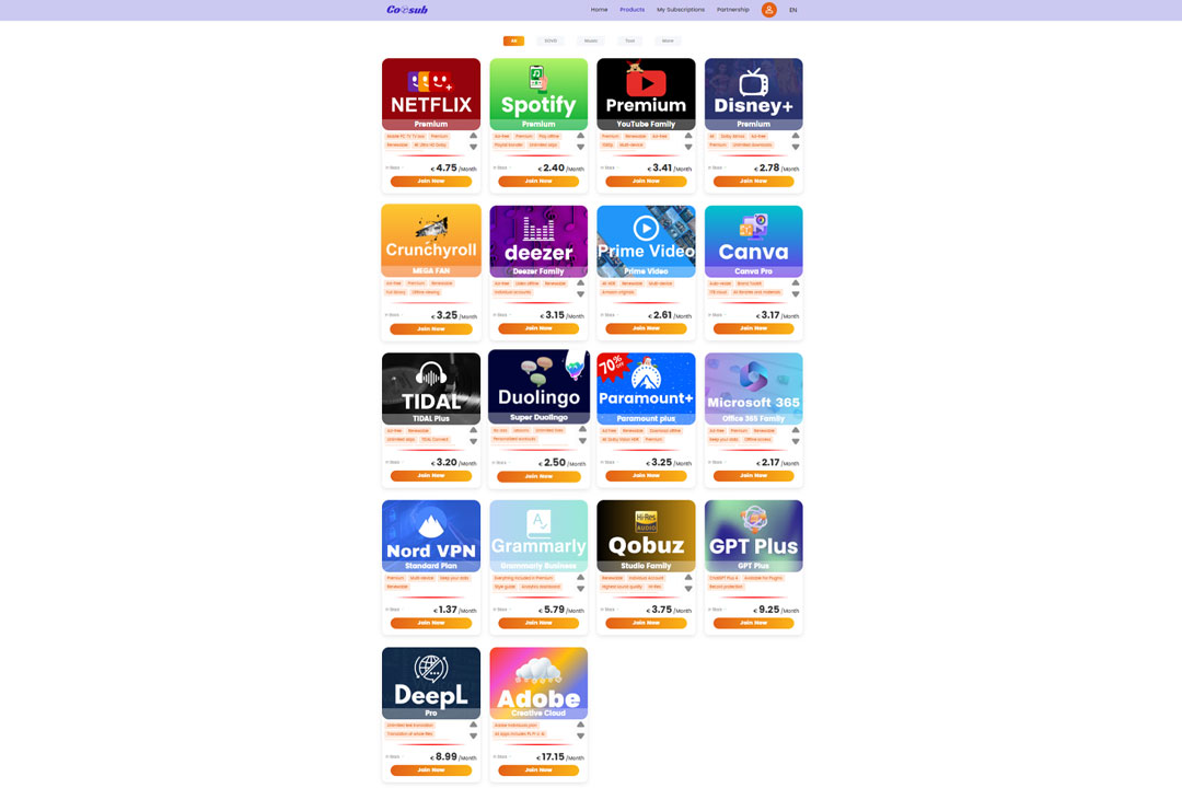 Uno dei principali punti di forza di Coosub è l’ampia varietà di servizi supportati, non solo legati all’intrattenimento, ma anche a strumenti di produttività, apprendimento e sicurezza online. Questo consente di risparmiare su una vasta gamma di abbonamenti, spesso presenti nel budget mensile di famiglie, studenti o professionisti.