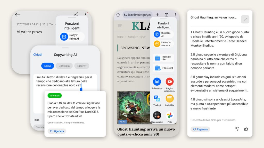 Ampio spazio è dedicato anche all’intelligenza artificiale, con una suite proprietaria che include AI Toolbox 2.0 (con strumenti come AI Summary, AI Writer, AI Translation e AI Reply), oltre a AI Creativity per l’editing fotografico con funzionalità avanzate come AI Eraser e AI Reframe. Tutti questi strumenti vengono attivati contestualmente alle app in uso e integrati con un pannello a scomparsa laterale (Smart Sidebar).