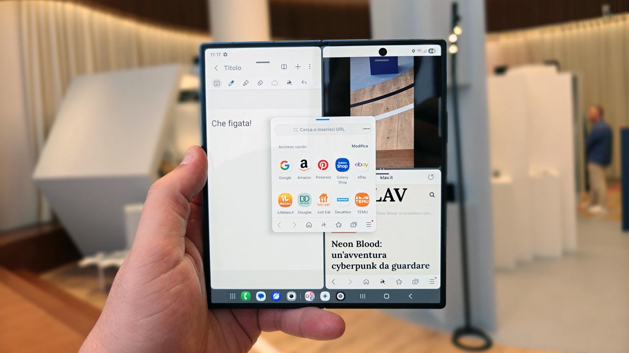 La potenza del pieghevole si vede anche nella gestione del multitasking: i risultati delle AI possono essere mostrati in finestre popup, lasciando il contenuto originale ben visibile. E tramite Multi Window è possibile trascinare testi o immagini generate dall’AI direttamente nelle app aperte, per comporre email, messaggi o post in pochi gesti.